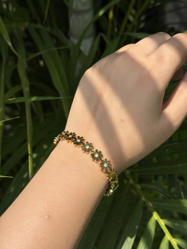 A delicate stainless steel bracelet featuring floral charm accents. Anti-tarnish | Sweat & Water Proof for long-lasting brilliance.