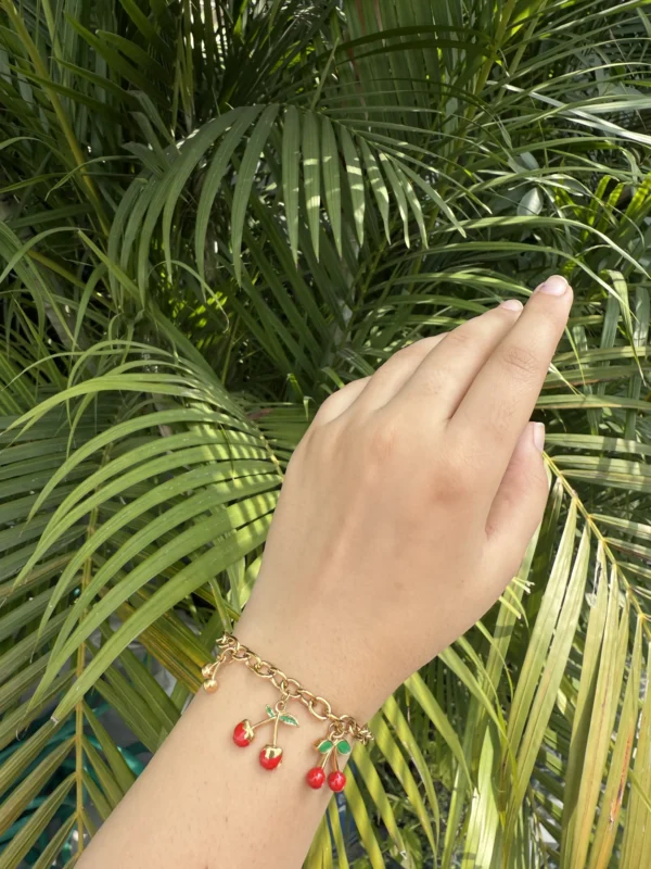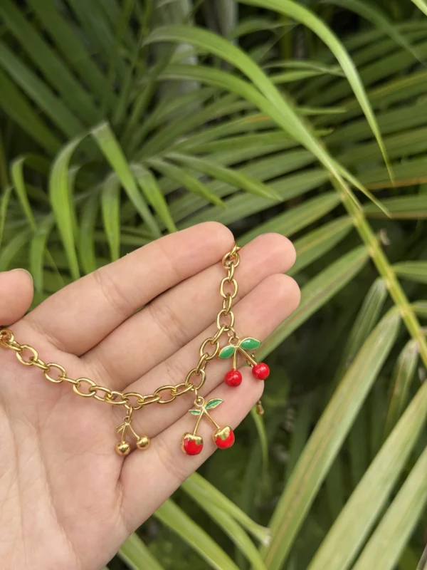 A playful stainless steel charm bracelet featuring adorable cherry motifs. Anti-tarnish | Sweat & Water Proof for lasting shine.